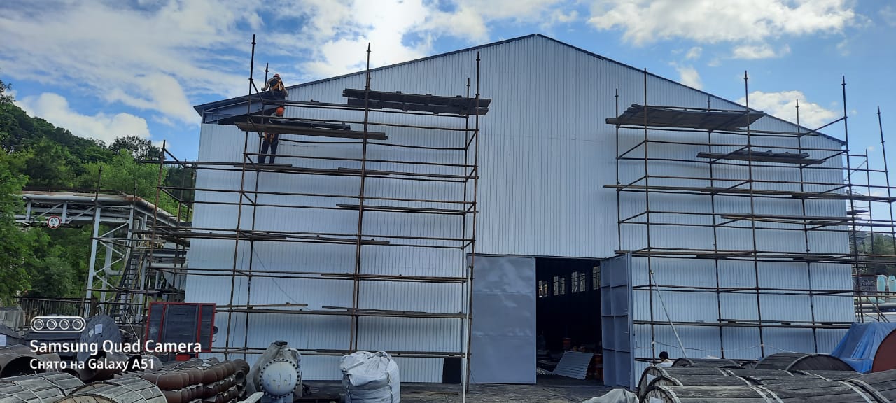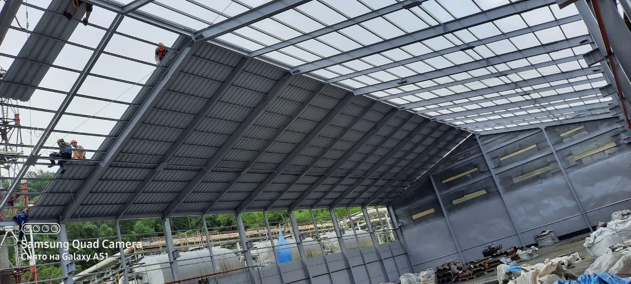 В основной фронт работ входил демонтаж кровельного покрытия склада, антикоррозийная обработка металлических конструкций, общей площадью более 2500 квадратных метров и монтаж профилированного листа. Кроме того, были произведены работы по устройству отмостки здания.